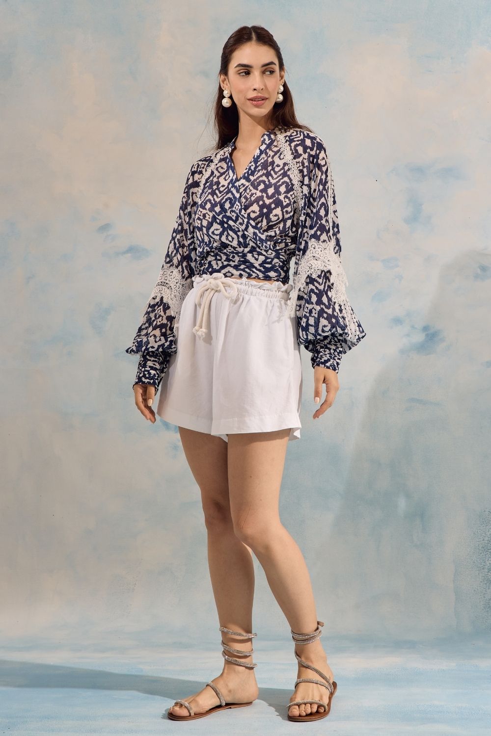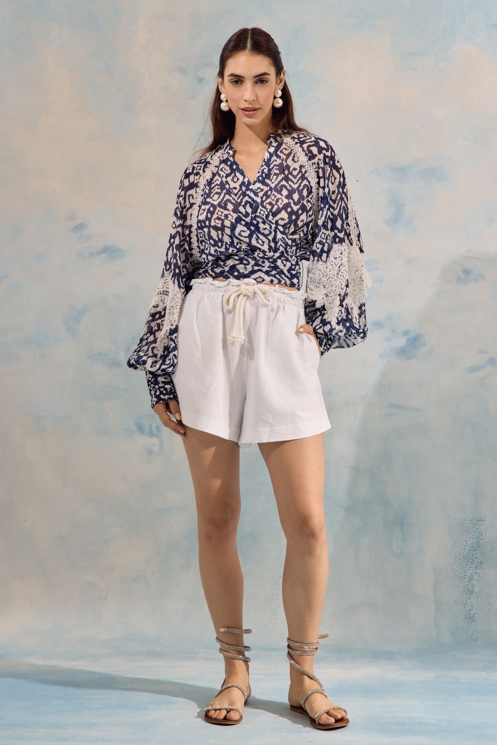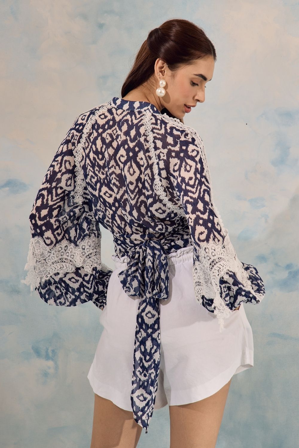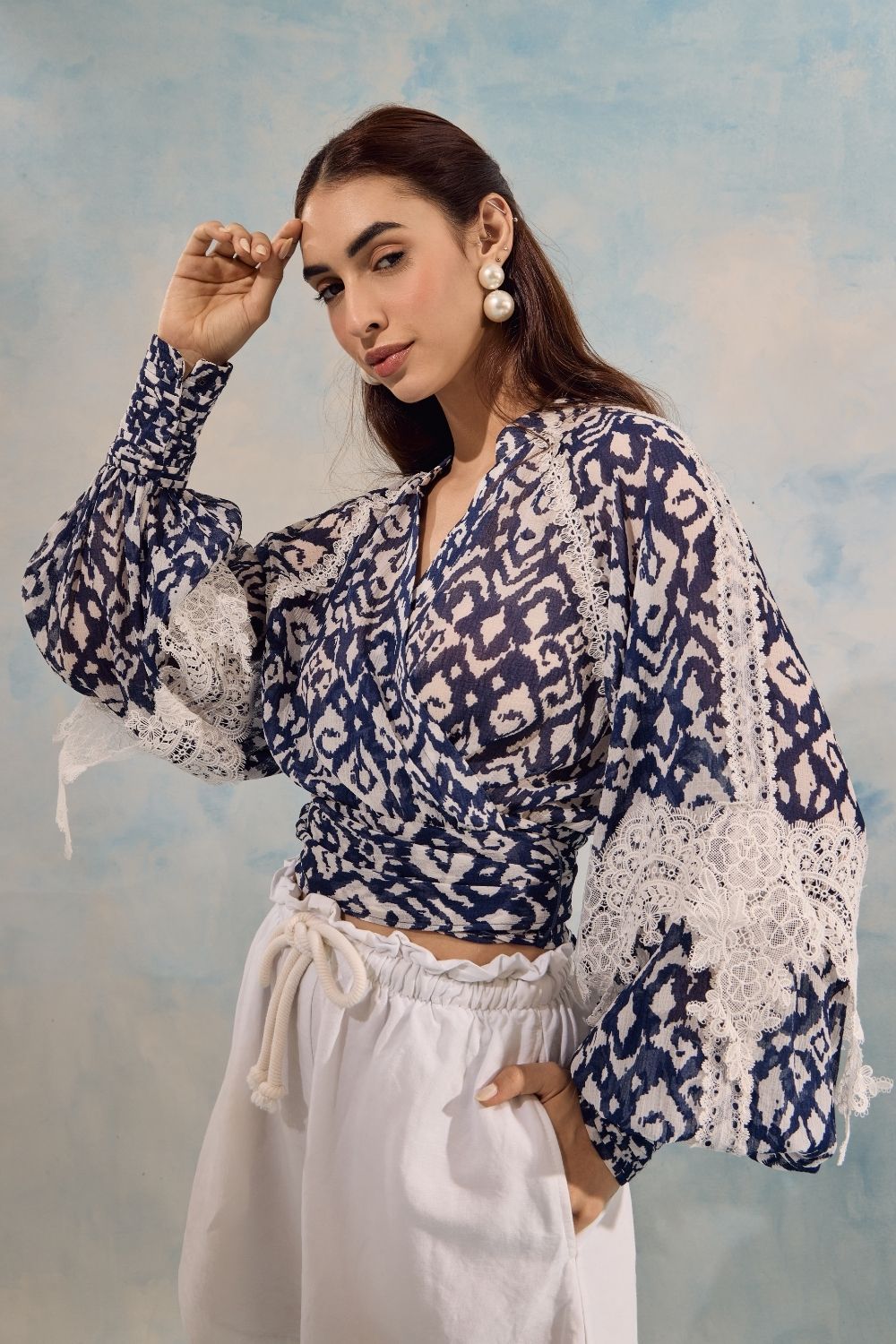 TOP- Abstract ikat inspired pattern, wrap top, relaxed fit with gathered waist ,long bishop sleeves with lace inserts and smocked cuffs, v-neck wrap style, tieup at the back.